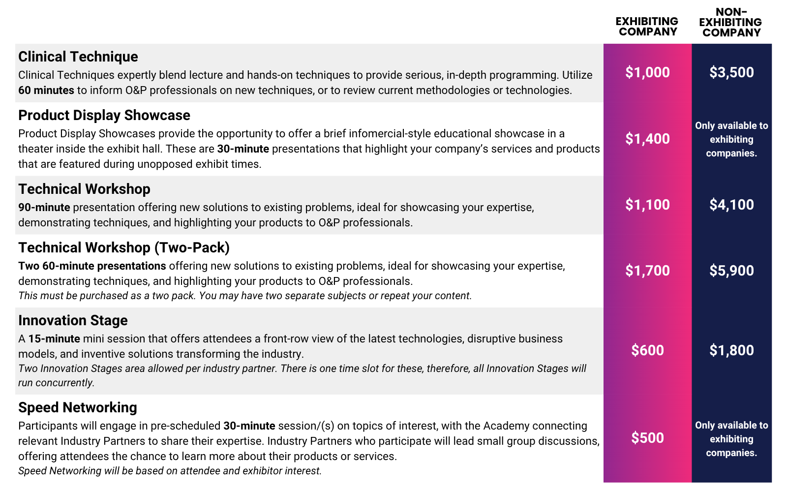 Starting each June, the Academy is pleased to offer select educational session sponsorships to non-exhibiting companies. Don’t miss this unique chance to engage with the O&P community and elevate your brand’s influence. To make your reservation, please contact Kate Feuling at kfeuling@oandp.org.