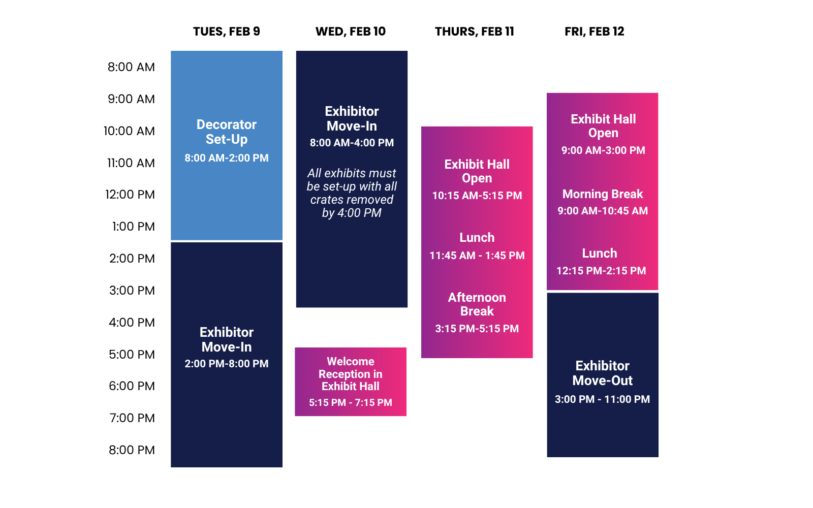 This schedule is subject to change. When planning for the event, please use the Exhibitor Service Manual as your main resource.